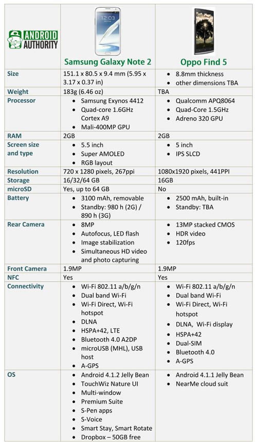 จากตารางจะเห็นได้ว่าถึงแม้หน้าจอของ Find 5 จะมีขนาดเล็กกว่าแต่ความละเอียดของหน้าจอที่ Full HD 1080P นั้นละเอียดกว่าจอของ Galaxy note 2 ที่ 720p ช่วยให้การแสดงผลสื่อต่างๆ เช่น รูปภาพ, วิดีโอ, เกม Find 5 สามารถแสดงผลได้ดีกว่าอย่างชัดเจน